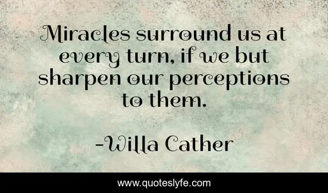 This page presents the quote "Miracles surround us at every turn, if we but sharpen our perceptions to them.". Author of this quote is Willa Cather. This quote is about miracles, faith, inspirational, enthusiasm, miracles-of-life, willa-cather,.