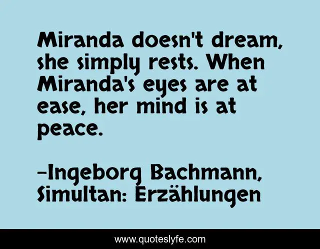 This page presents the quote "Miranda doesn't dream, she simply rests. When Miranda's eyes are at ease, her mind is at peace.". Author of this quote is Ingeborg Bachmann, Simultan: Erzählungen. This quote is about peace, dream, rest,.