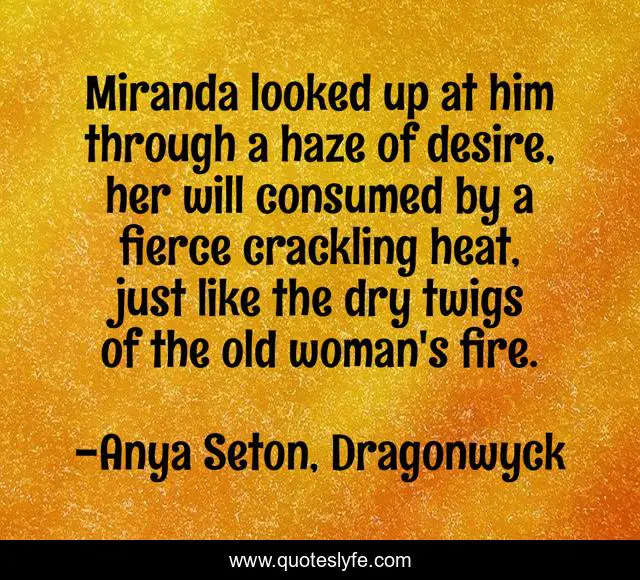 This page presents the quote "Miranda looked up at him through a haze of desire, her will consumed by a fierce crackling heat, just like the dry twigs of the old woman's fire.". Author of this quote is Anya Seton, Dragonwyck. This quote is about lust, witchcraft,.