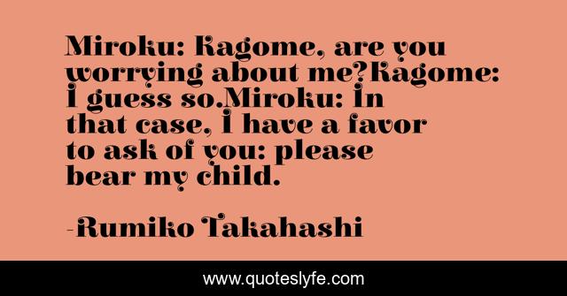 This page presents the quote "Miroku: Kagome, are you worrying about me?Kagome: I guess so.Miroku: In that case, I have a favor to ask of you: please bear my child.". Author of this quote is Rumiko Takahashi. This quote is about rumiko, inuyasha, miroku, kagome, bear, anime, child, my, manga,.