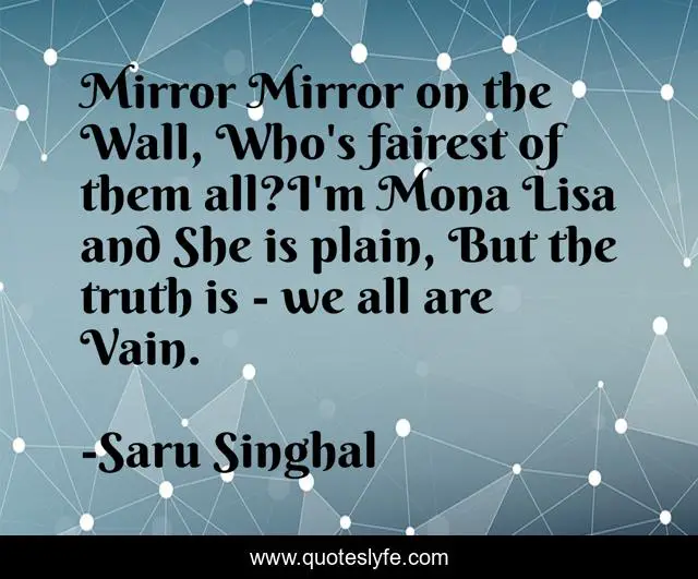 This page presents the quote "Mirror Mirror on the Wall, Who's fairest of them all?I'm Mona Lisa and She is plain, But the truth is - we all are Vain.". Author of this quote is Saru Singhal. This quote is about life, vanity,.
