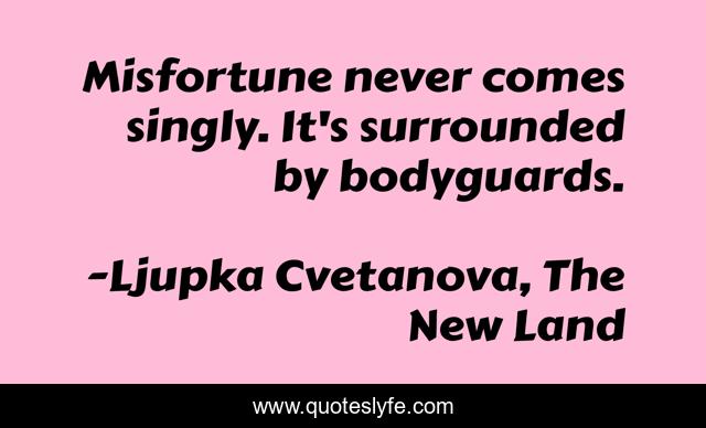 This page presents the quote "Misfortune never comes singly. It's surrounded by bodyguards.". Author of this quote is Ljupka Cvetanova, The New Land. This quote is about bodyguard, aphorism, politician, capitalist, democracy, quote, come-singly, surrounded, riches,.