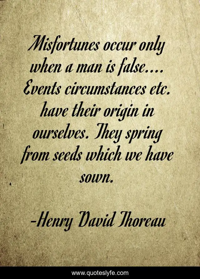 This page presents the quote "Misfortunes occur only when a man is false.... Events circumstances etc. have their origin in ourselves. They spring from seeds which we have sown.". Author of this quote is Henry David Thoreau. .