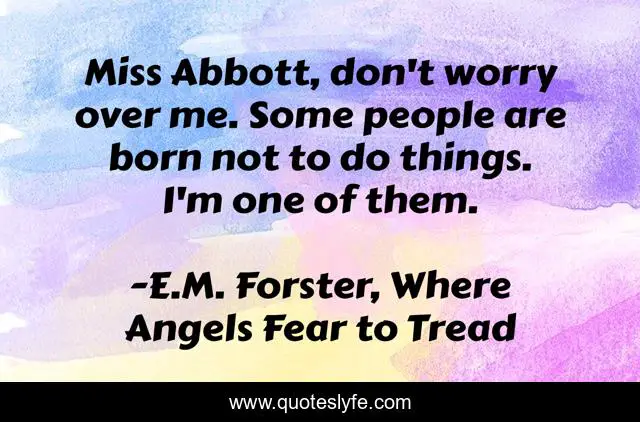 This page presents the quote "Miss Abbott, don't worry over me. Some people are born not to do things. I'm one of them.". Author of this quote is E.M. Forster, Where Angels Fear to Tread. This quote is about em-forster, philosophy, life, where-angels-fear-to-tread, forster,.