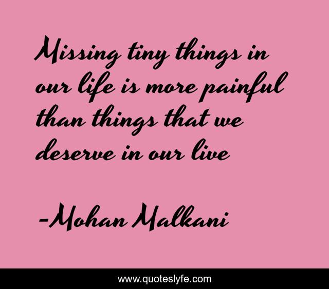 This page presents the quote "Missing tiny things in our life is more painful than things that we deserve in our live". Author of this quote is Mohan Malkani. .