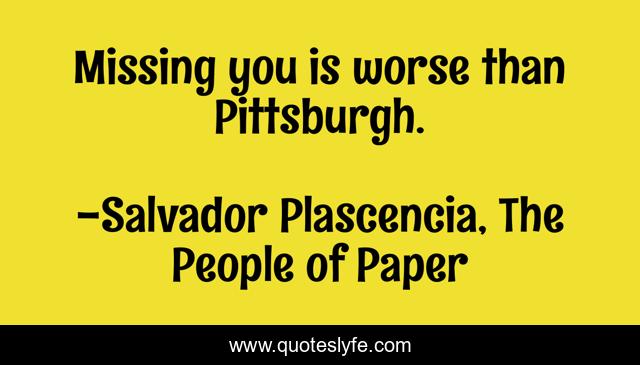 "Salvador Plascencia, The People of Paper Quotes." Quoteslyfe.com, 2025. Mon. 08 Dec. 2025. <https://www.quoteslyfe.com/quote/Missing-you-is-worse-than-Pittsburgh-18038>.