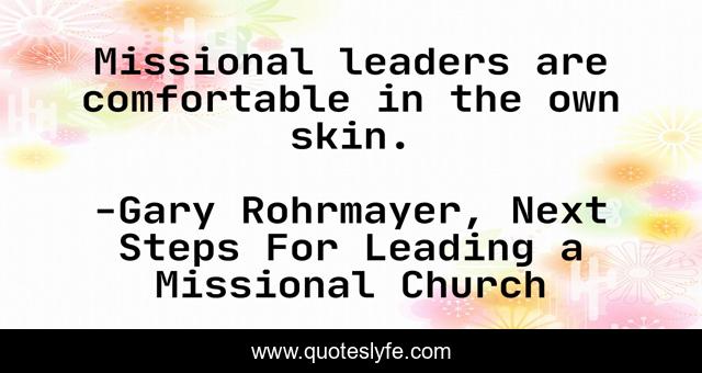 This page presents the quote "Missional leaders are comfortable in the own skin.". Author of this quote is Gary Rohrmayer, Next Steps For Leading a Missional Church. This quote is about leadership-characteristics, missionaries, leaders, pastor, mission, missionary-work, leadership, pastors, missional,.