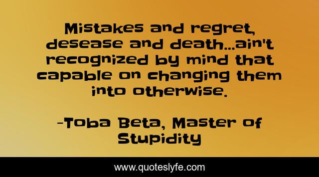 This page presents the quote "Mistakes and regret, desease and death...ain't recognized by mind that capable on changing them into otherwise.". Author of this quote is Toba Beta, Master of Stupidity. This quote is about misconceptions, desease, death, regret, mistakes,.
