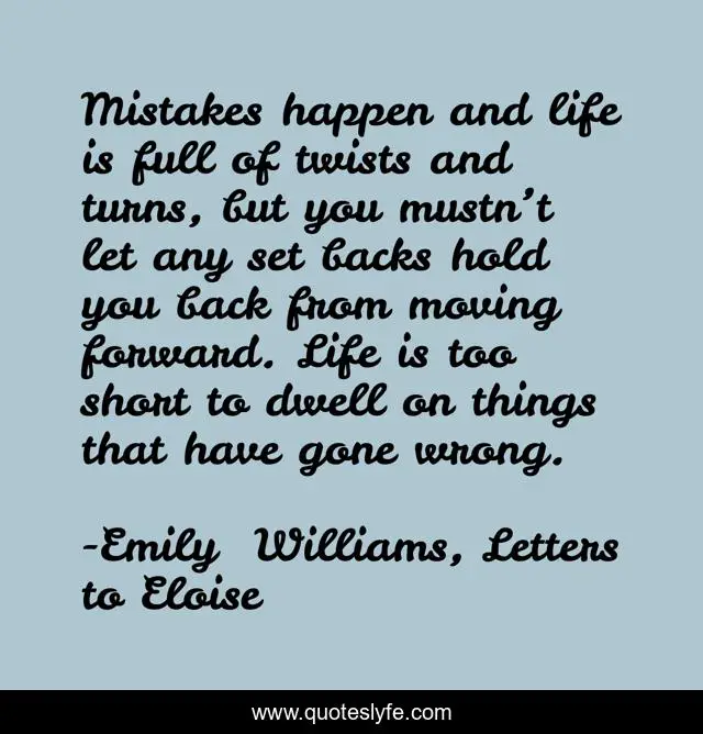 This page presents the quote "Mistakes happen and life is full of twists and turns, but you mustn’t let any set backs hold you back from moving forward. Life is too short to dwell on things that have gone wrong.". Author of this quote is Emily Williams, Letters to Eloise. This quote is about pain, hurt, wrong, mistakes, life-lessons, letters-to-eloise,.
