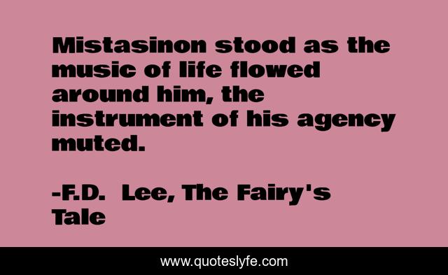 This page presents the quote "Mistasinon stood as the music of life flowed around him, the instrument of his agency muted.". Author of this quote is F.D. Lee, The Fairy's Tale. This quote is about lonely, lost, confusion, loneliness, fantasy-books, fantasy, sadness, fantasy-fiction,.