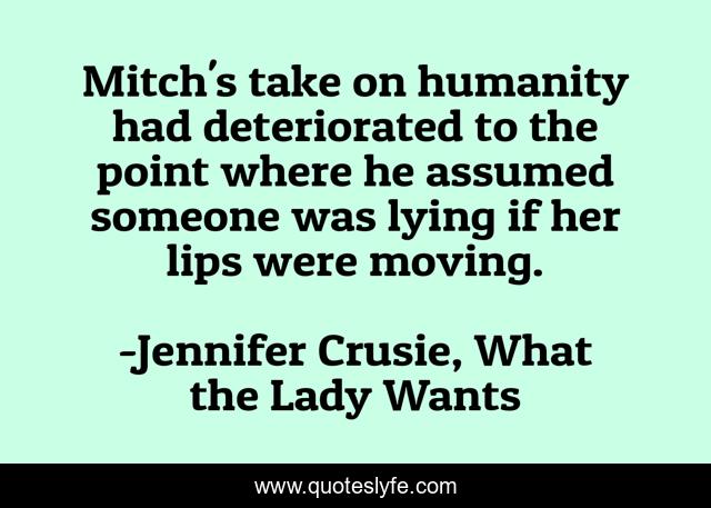 "Jennifer Crusie, What the Lady Wants Quotes." Quoteslyfe.com, 2025. Fri. 05 Dec. 2025. <https://www.quoteslyfe.com/quote/Mitch-s-take-on-humanity-had-deteriorated-167628>.