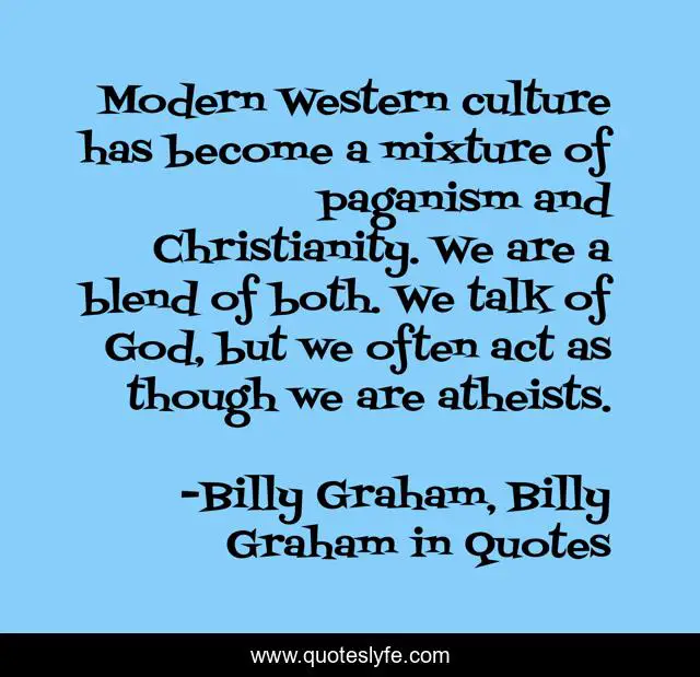 This page presents the quote "Modern Western culture has become a mixture of paganism and Christianity. We are a blend of both. We talk of God, but we often act as though we are atheists.". Author of this quote is Billy Graham, Billy Graham in Quotes. This quote is about religion, billy-graham,.