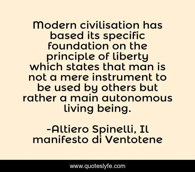 This page presents the quote "Modern civilisation has based its specific foundation on the principle of liberty which states that man is not a mere instrument to be used by others but rather a main autonomous living being.". Author of this quote is Altiero Spinelli, Il manifesto di Ventotene. This quote is about freedom, civilization, liberty, man,.