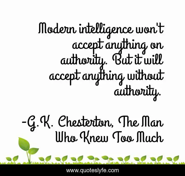 This page presents the quote "Modern intelligence won't accept anything on authority. But it will accept anything without authority.". Author of this quote is G.K. Chesterton, The Man Who Knew Too Much. This quote is about intelligence, authority,.