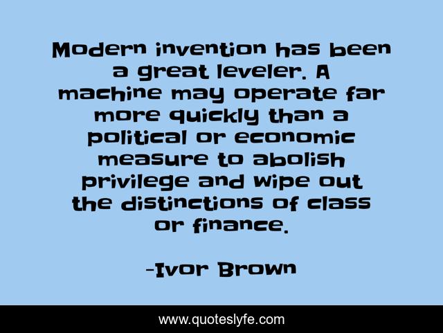This page presents the quote "Modern invention has been a great leveler. A machine may operate far more quickly than a political or economic measure to abolish privilege and wipe out the distinctions of class or finance.". Author of this quote is Ivor Brown. This quote is about technological-progress, technology, class, economic-inequality,.