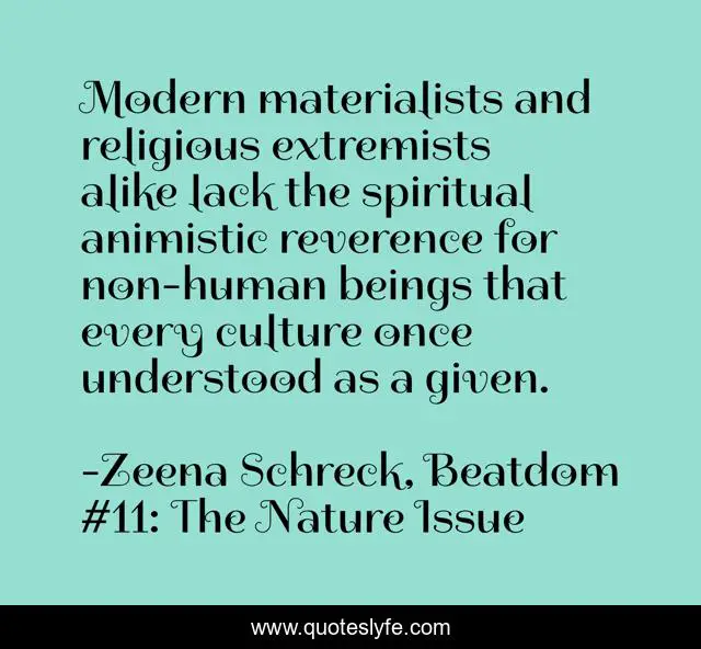 "Zeena Schreck, Beatdom #11: The Nature Issue Quotes." Quoteslyfe.com, 2025. Mon. 08 Dec. 2025. <https://www.quoteslyfe.com/quote/Modern-materialists-and-religious-extremists-alike-lack-207458>.