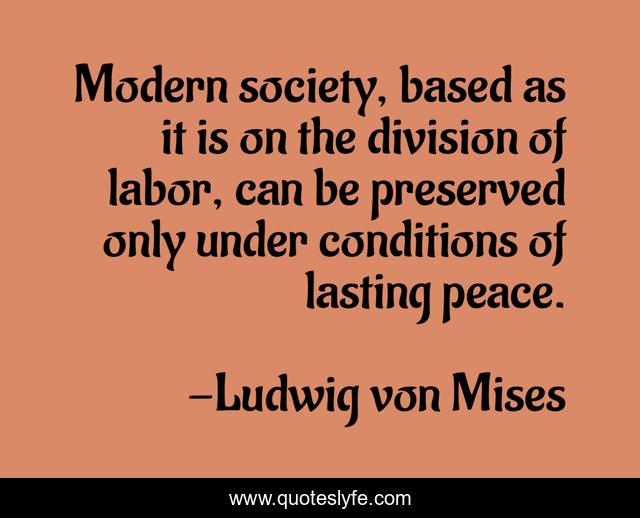 This page presents the quote "Modern society, based as it is on the division of labor, can be preserved only under conditions of lasting peace.". Author of this quote is Ludwig von Mises. This quote is about society, labor, division,.