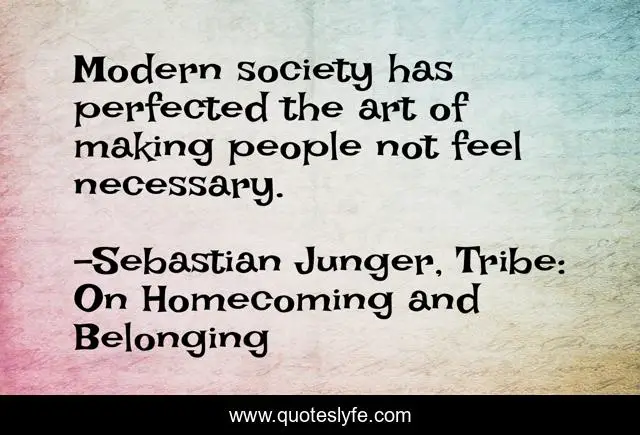 This page presents the quote "Modern society has perfected the art of making people not feel necessary.". Author of this quote is Sebastian Junger, Tribe: On Homecoming and Belonging. This quote is about importance, society, community,.