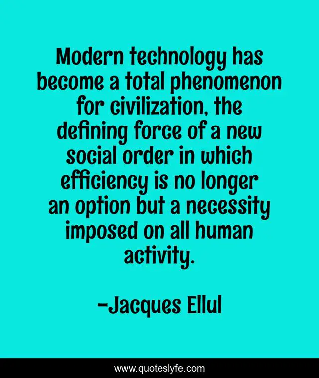 This page presents the quote "Modern technology has become a total phenomenon for civilization, the defining force of a new social order in which efficiency is no longer an option but a necessity imposed on all human activity.". Author of this quote is Jacques Ellul. This quote is about efficiency, social-order, effectiveness, technology,.