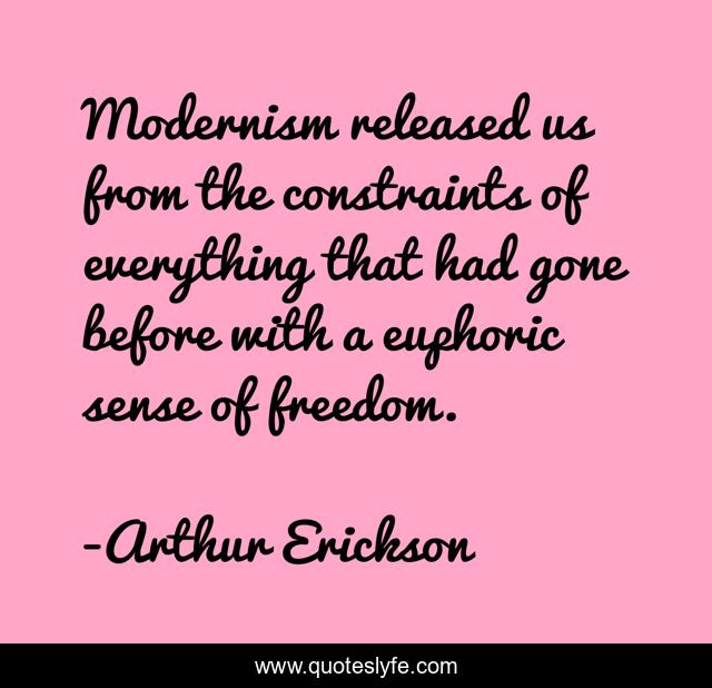 This page presents the quote "Modernism released us from the constraints of everything that had gone before with a euphoric sense of freedom.". Author of this quote is Arthur Erickson. This quote is about gone, sense, everything,.