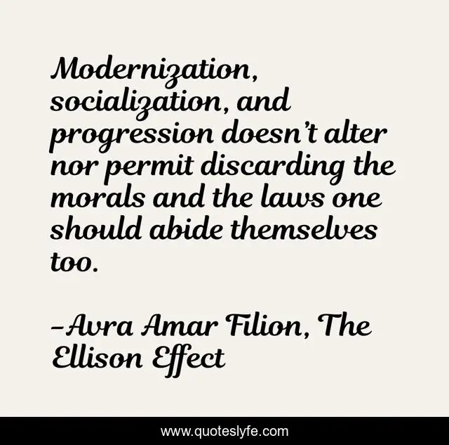 This page presents the quote "Modernization, socialization, and progression doesn’t alter nor permit discarding the morals and the laws one should abide themselves too.". Author of this quote is Avra Amar Filion, The Ellison Effect. This quote is about modernization, larry-ellison, morals,.