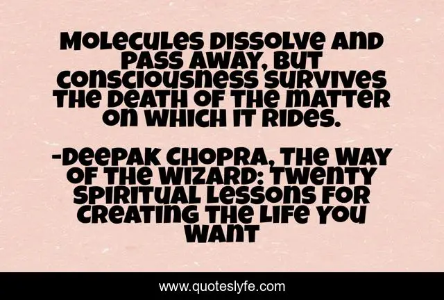 This page presents the quote "Molecules dissolve and pass away, but consciousness survives the death of the matter on which it rides.". Author of this quote is Deepak Chopra, The Way of the Wizard: Twenty Spiritual Lessons for Creating the Life You Want. This quote is about spirituality, life, death, philosophy,.