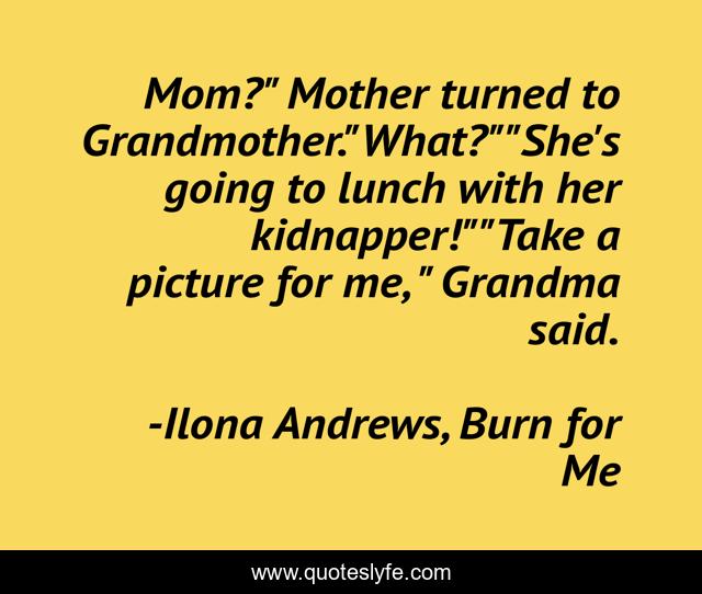 This page presents the quote "Mom?" Mother turned to Grandmother."What?""She's going to lunch with her kidnapper!""Take a picture for me, " Grandma said.". Author of this quote is Ilona Andrews, Burn for Me. This quote is about grandma-frida, mother,.