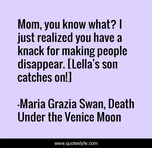 This page presents the quote "Mom, you know what? I just realized you have a knack for making people disappear. [Lella's son catches on!]". Author of this quote is Maria Grazia Swan, Death Under the Venice Moon. This quote is about mystery, venice, italy, cozy,.