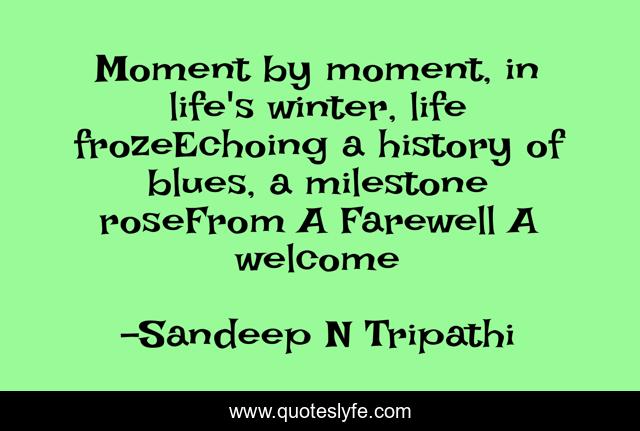This page presents the quote "Moment by moment, in life's winter, life frozeEchoing a history of blues, a milestone roseFrom A Farewell A welcome". Author of this quote is Sandeep N Tripathi. This quote is about life, welcome, farewell, moment, winter,.