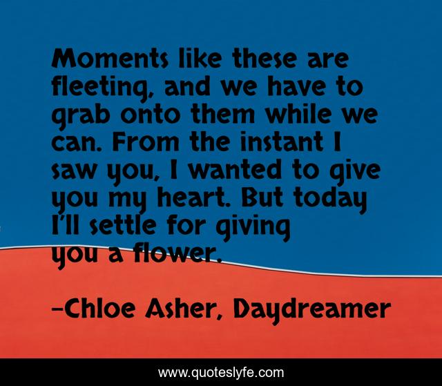 This page presents the quote "Moments like these are fleeting, and we have to grab onto them while we can. From the instant I saw you, I wanted to give you my heart. But today I’ll settle for giving you a flower.". Author of this quote is Chloe Asher, Daydreamer. This quote is about new-adult, romance, love, contemporary, affection,.