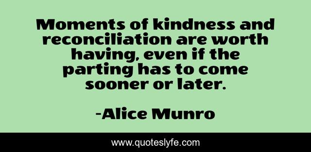 This page presents the quote "Moments of kindness and reconciliation are worth having, even if the parting has to come sooner or later.". Author of this quote is Alice Munro. This quote is about reconciliation, kindness,.