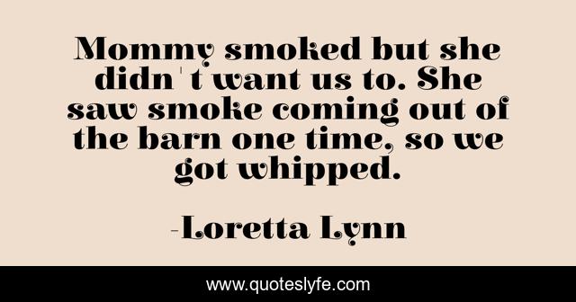 This page presents the quote "Mommy smoked but she didn't want us to. She saw smoke coming out of the barn one time, so we got whipped.". Author of this quote is Loretta Lynn. This quote is about she, time,.