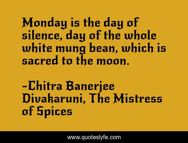 This page presents the quote "Monday is the day of silence, day of the whole white mung bean, which is sacred to the moon.". Author of this quote is Chitra Banerjee Divakaruni, The Mistress of Spices. This quote is about monday, moon,.
