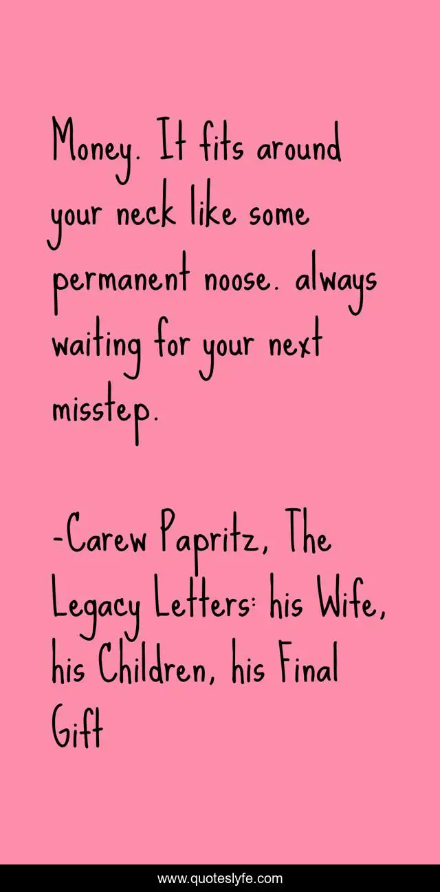 This page presents the quote "Money. It fits around your neck like some permanent noose. always waiting for your next misstep.". Author of this quote is Carew Papritz, The Legacy Letters: his Wife, his Children, his Final Gift. This quote is about money, book, the-legacy-letters, carew-papritz,.