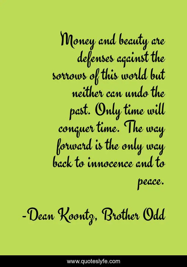 This page presents the quote "Money and beauty are defenses against the sorrows of this world but neither can undo the past. Only time will conquer time. The way forward is the only way back to innocence and to peace.". Author of this quote is Dean Koontz, Brother Odd. This quote is about perseverance, moving-forward, beauty, innocense, money, peace, sorrows, time, odd-thomas,.