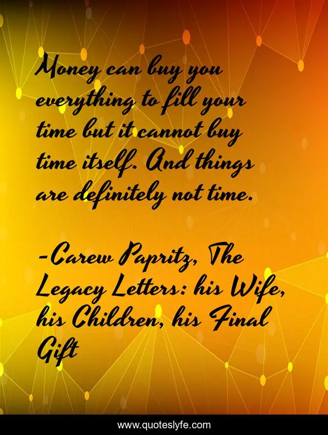 This page presents the quote "Money can buy you everything to fill your time but it cannot buy time itself. And things are definitely not time.". Author of this quote is Carew Papritz, The Legacy Letters: his Wife, his Children, his Final Gift. This quote is about money, quotes, the-legacy-letters, carew-papritz, time, quotes-to-live-by,.