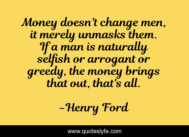 This page presents the quote "Money doesn't change men, it merely unmasks them. If a man is naturally selfish or arrogant or greedy, the money brings that out, that's all.". Author of this quote is Henry Ford. This quote is about enthusiasm, self-awareness, inspirational,.