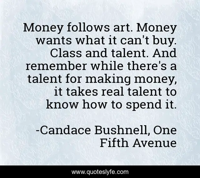 This page presents the quote "Money follows art. Money wants what it can't buy. Class and talent. And remember while there's a talent for making money, it takes real talent to know how to spend it.". Author of this quote is Candace Bushnell, One Fifth Avenue. This quote is about money, talent,.