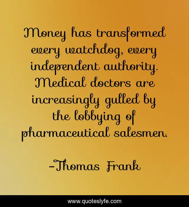 This page presents the quote "Money has transformed every watchdog, every independent authority. Medical doctors are increasingly gulled by the lobbying of pharmaceutical salesmen.". Author of this quote is Thomas Frank. This quote is about money, authority,.