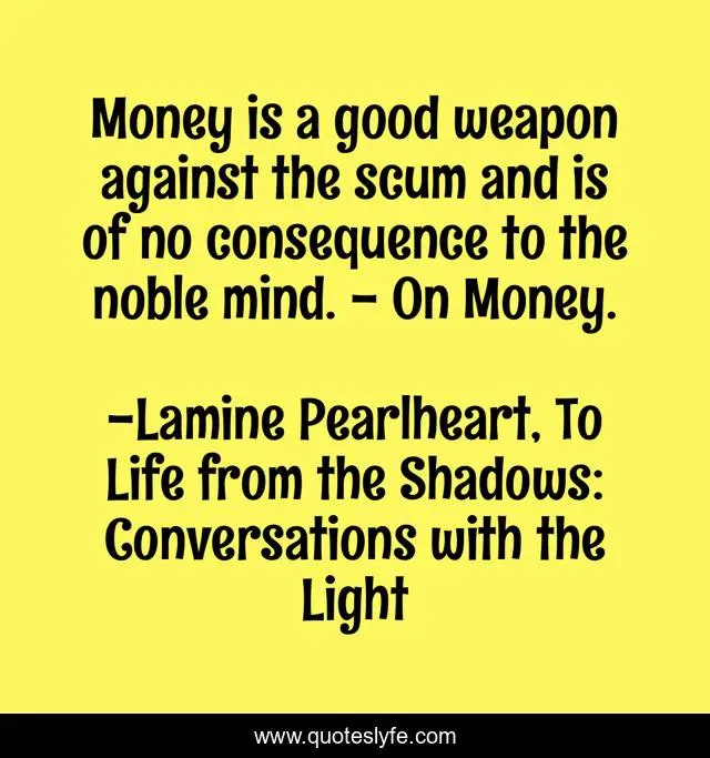 "Lamine Pearlheart, To Life from the Shadows: Conversations with the Light Quotes." Quoteslyfe.com, 2025. Sun. 07 Dec. 2025. <https://www.quoteslyfe.com/quote/Money-is-a-good-weapon-against-the-236564>.