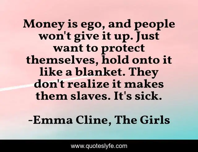 This page presents the quote "Money is ego, and people won't give it up. Just want to protect themselves, hold onto it like a blanket. They don't realize it makes them slaves. It's sick.". Author of this quote is Emma Cline, The Girls. This quote is about money, ego,.