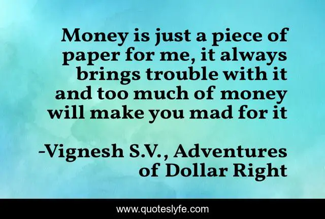 This page presents the quote "Money is just a piece of paper for me, it always brings trouble with it and too much of money will make you mad for it". Author of this quote is Vignesh S.V., Adventures of Dollar Right. This quote is about money, money-not-happiness, trouble, troublemaker, humanity, not-being-rich,.