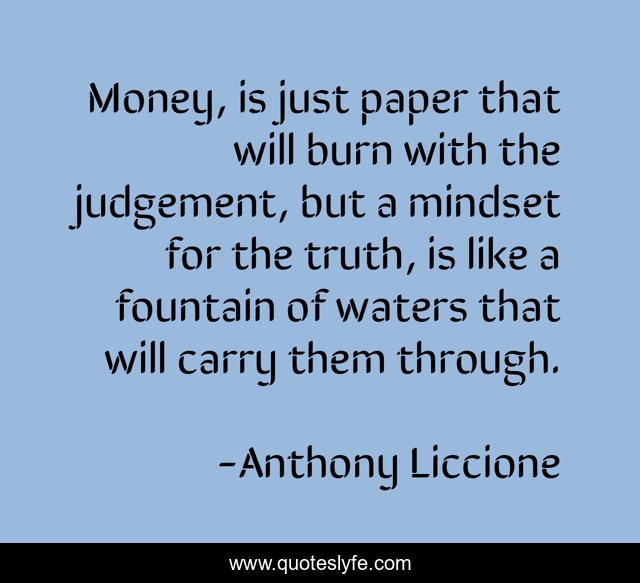 This page presents the quote "Money, is just paper that will burn with the judgement, but a mindset for the truth, is like a fountain of waters that will carry them through.". Author of this quote is Anthony Liccione. This quote is about heaven-and-hell, judgement, truth, money,.