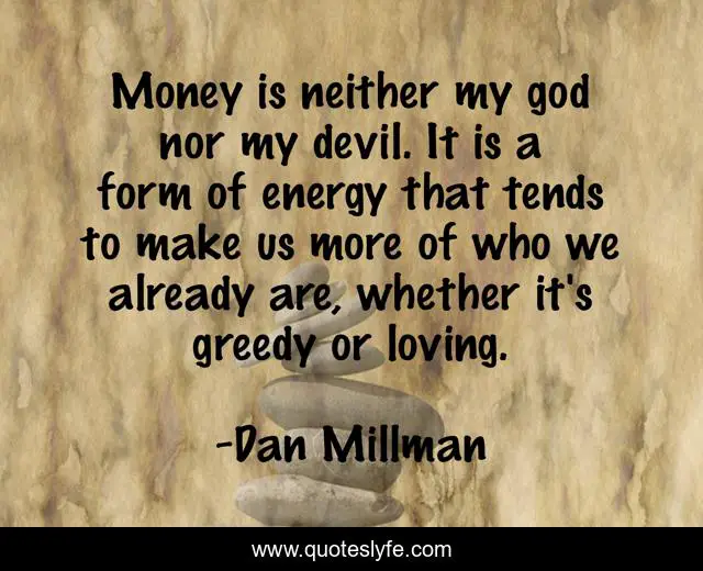 This page presents the quote "Money is neither my god nor my devil. It is a form of energy that tends to make us more of who we already are, whether it's greedy or loving.". Author of this quote is Dan Millman. This quote is about god, energy, loving,.
