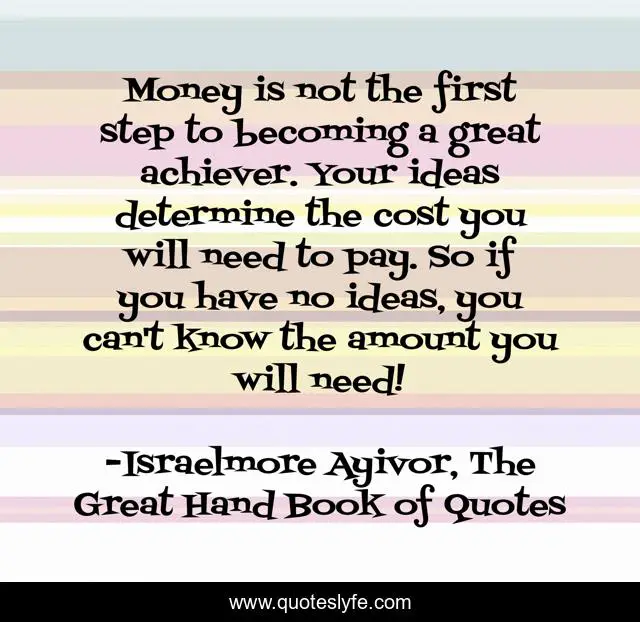 This page presents the quote "Money is not the first step to becoming a great achiever. Your ideas determine the cost you will need to pay. So if you have no ideas, you can't know the amount you will need!". Author of this quote is Israelmore Ayivor, The Great Hand Book of Quotes. This quote is about money, idea, achiever, cost, determine, 1st, food-for-thought, pay, coins,.