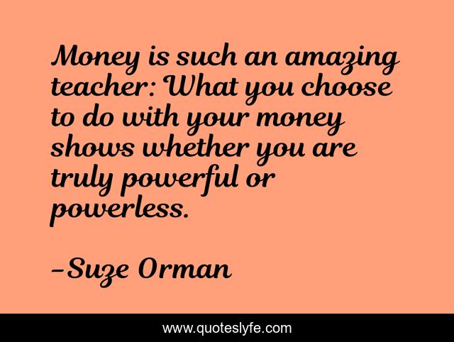 This page presents the quote "Money is such an amazing teacher: What you choose to do with your money shows whether you are truly powerful or powerless.". Author of this quote is Suze Orman. This quote is about money, amazing, powerful,.