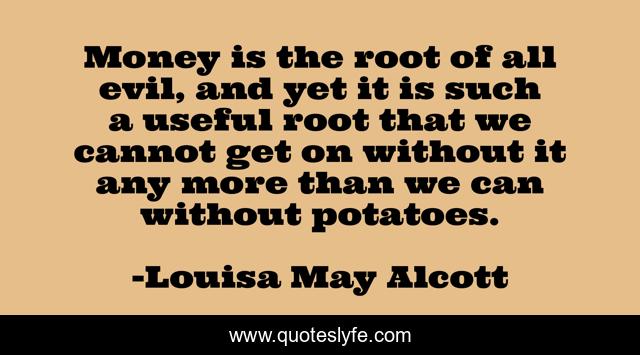 This page presents the quote "Money is the root of all evil, and yet it is such a useful root that we cannot get on without it any more than we can without potatoes.". Author of this quote is Louisa May Alcott. This quote is about potatoes, without, evil,.