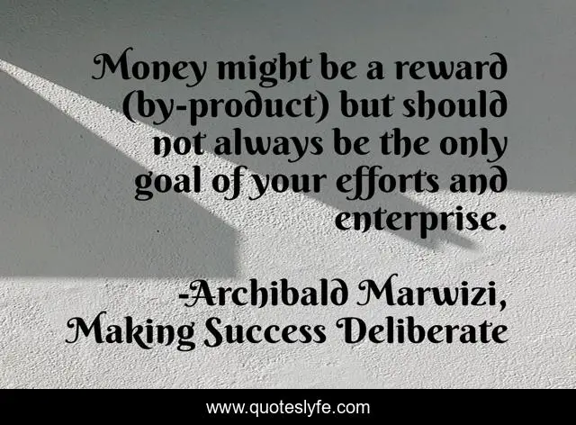 This page presents the quote "Money might be a reward (by-product) but should not always be the only goal of your efforts and enterprise.". Author of this quote is Archibald Marwizi, Making Success Deliberate. This quote is about life, success, behaviour, attitude, legacy, growth, purpose, inspirational, leadership,.