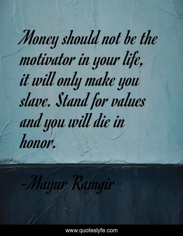 This page presents the quote "Money should not be the motivator in your life, it will only make you slave. Stand for values and you will die in honor.". Author of this quote is Mayur Ramgir. This quote is about money, values,.