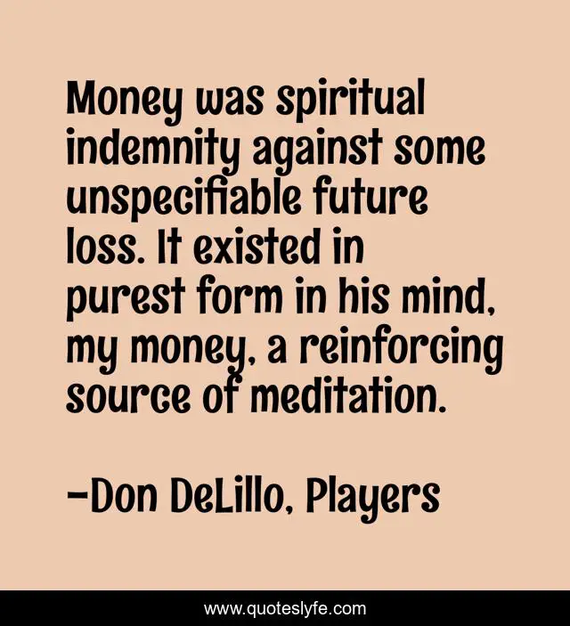 "Don DeLillo, Players Quotes." Quoteslyfe.com, 2025. Fri. 05 Dec. 2025. <https://www.quoteslyfe.com/quote/Money-was-spiritual-indemnity-against-some-unspecifiable-80170>.